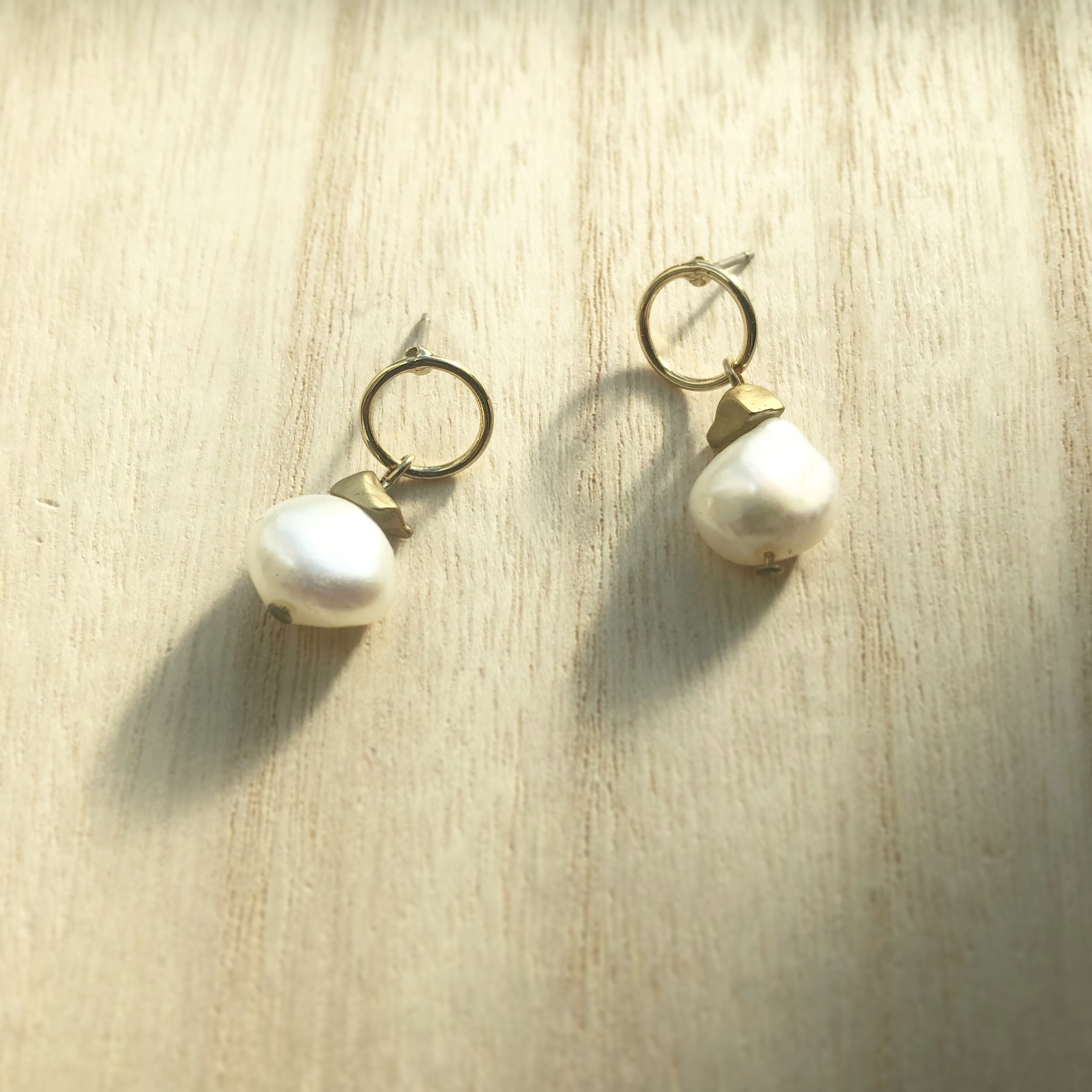 個性的な形の ぽろっとした淡水パールの一粒を上品なチタンピアスにしました。