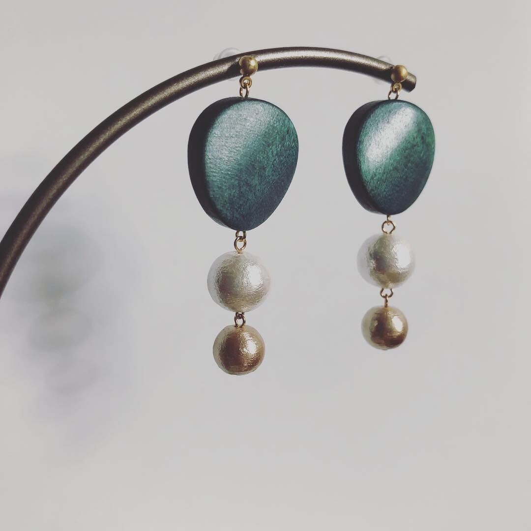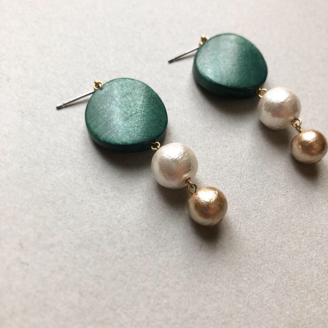 深い緑のウッドと、ブラウンとホワイトのコットンパールを組み合わせたチタンピアス。