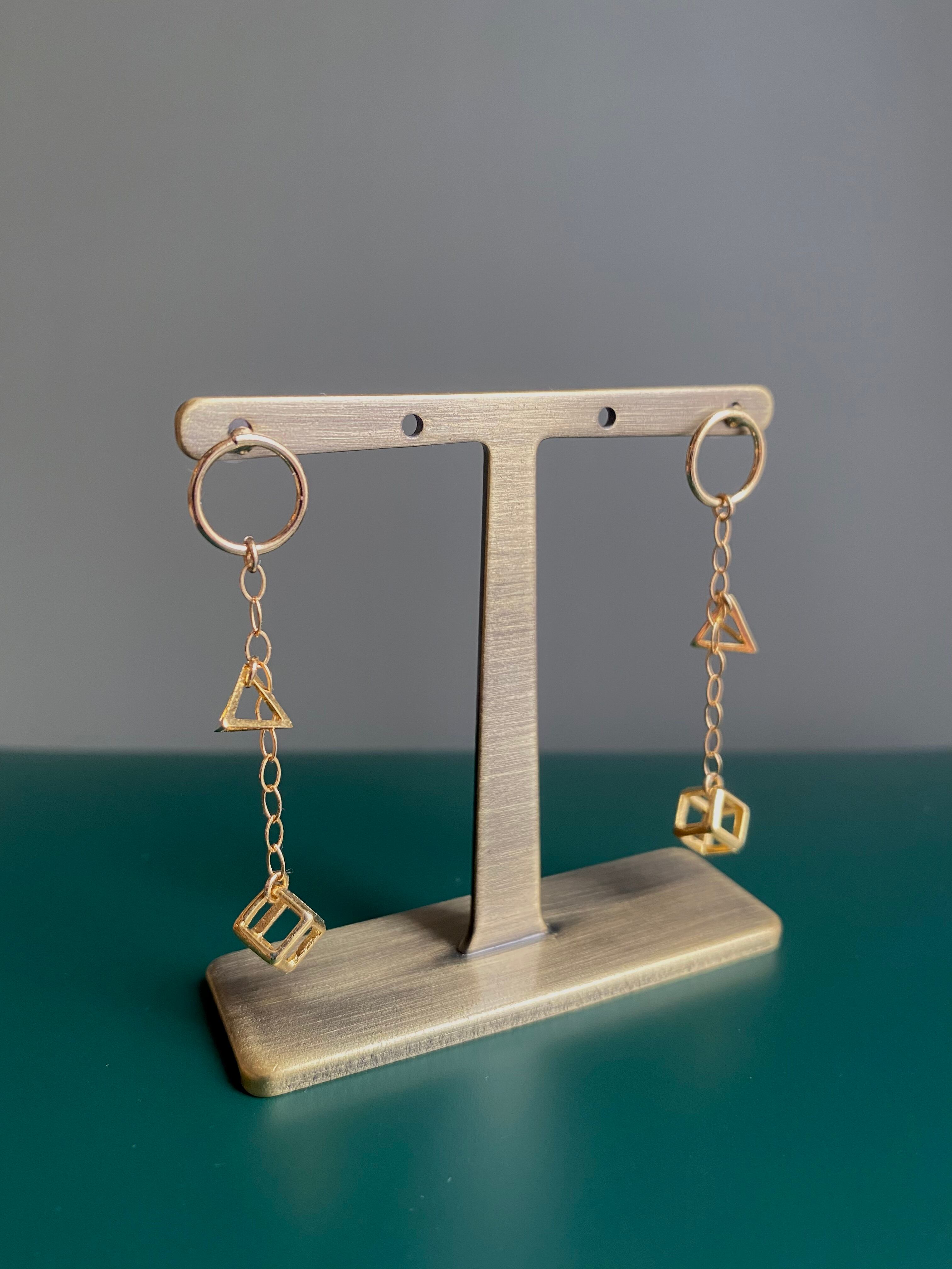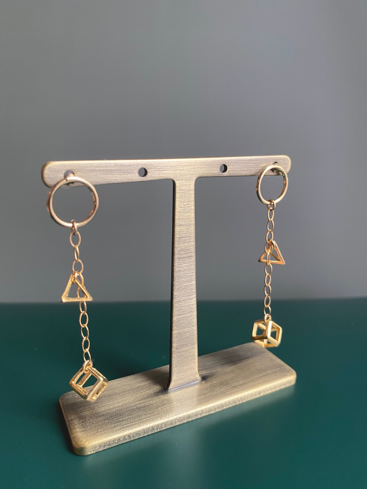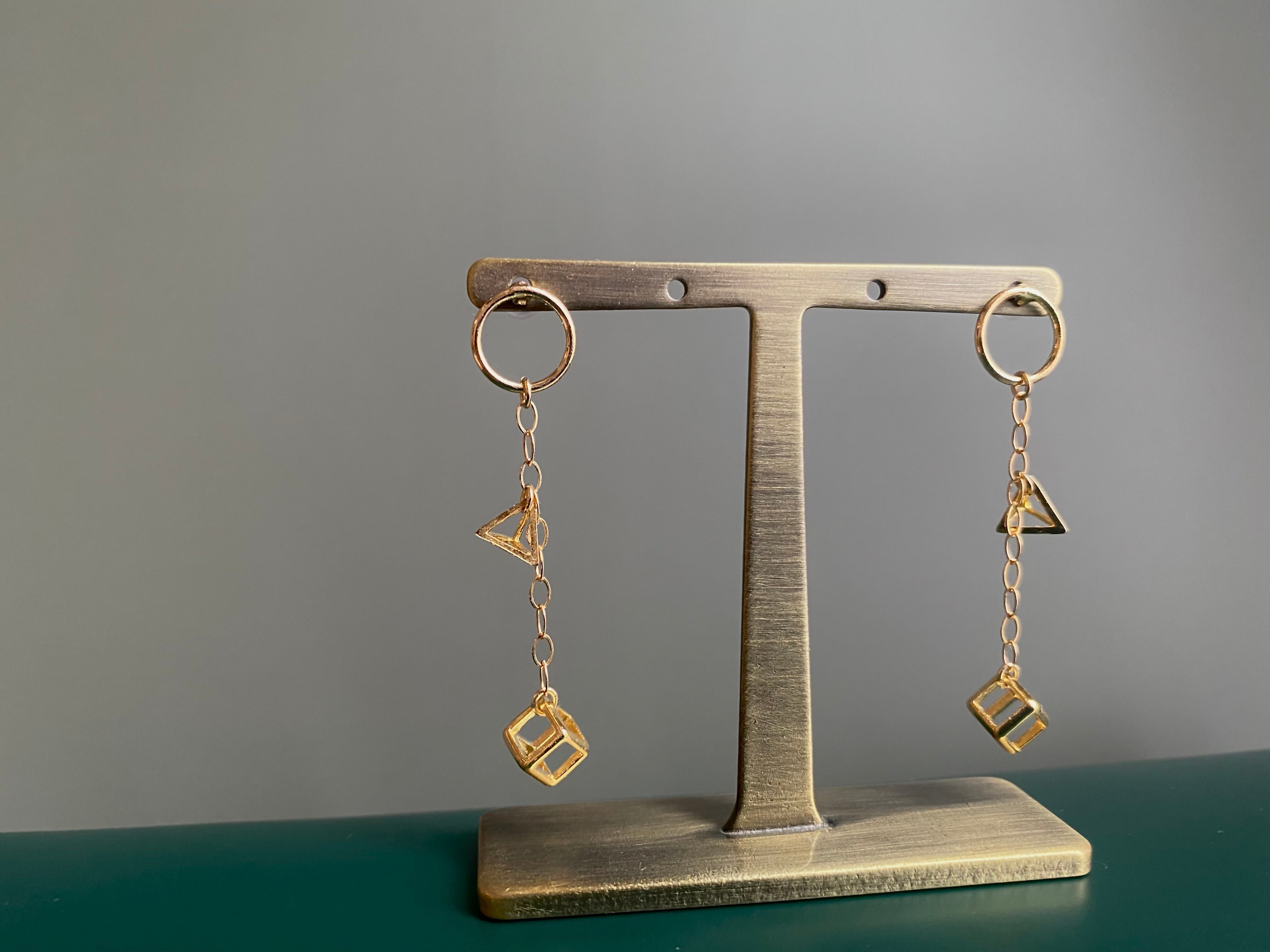 丸と、三角と、四角のモチーフが耳元で揺れるピアスです。