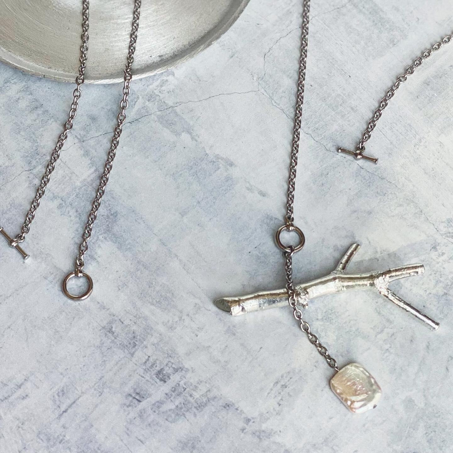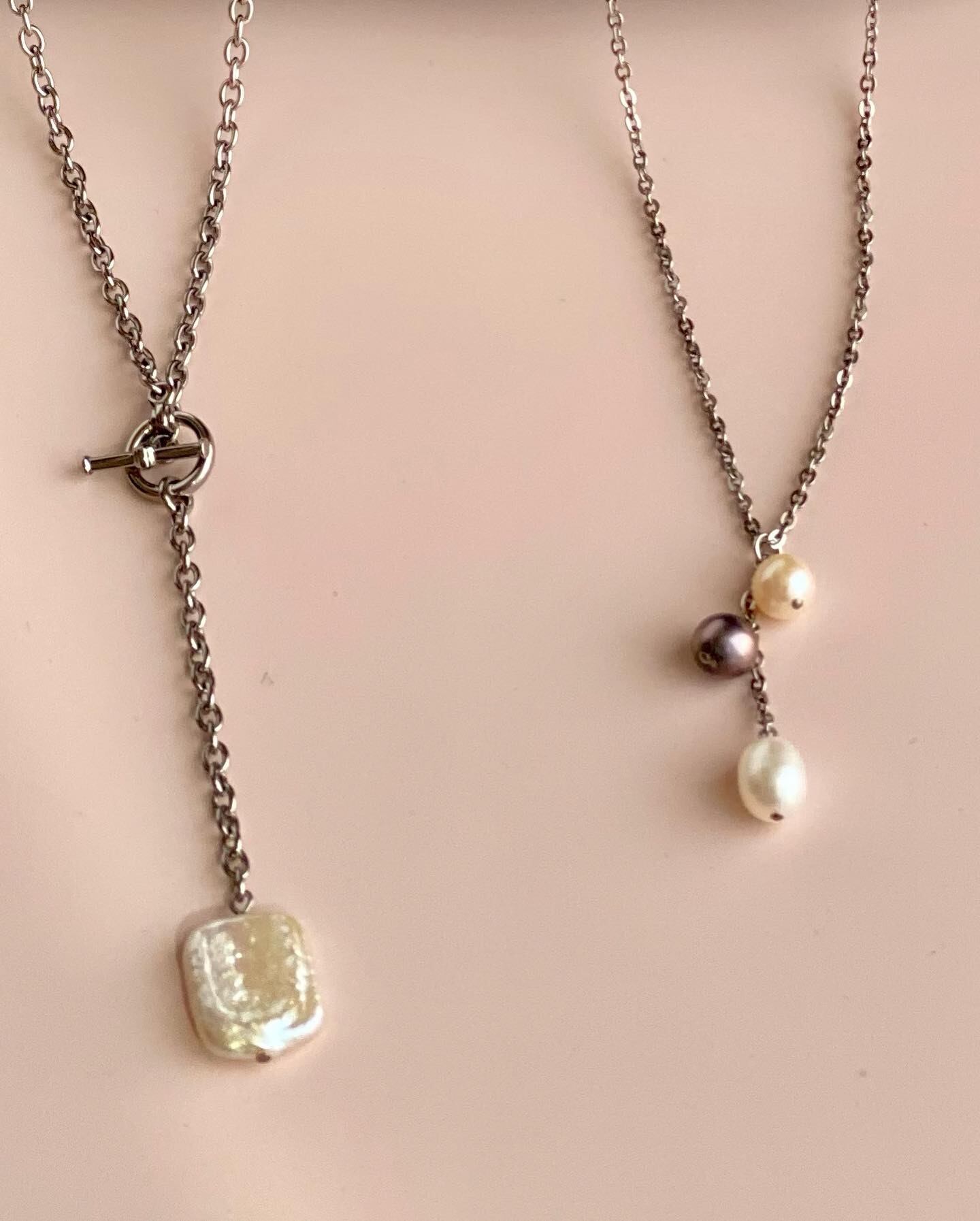全てのパーツがチタンで作られたチェーンネックレスに自然の造形が美しいパールをプラスしました。