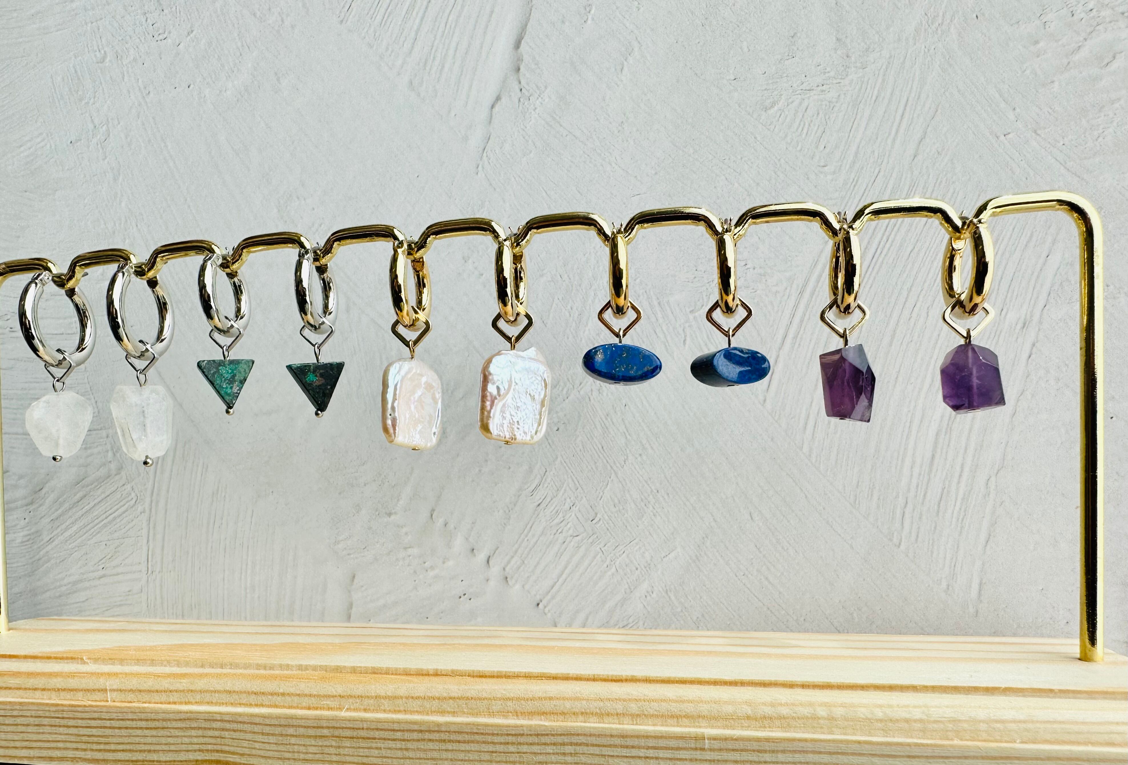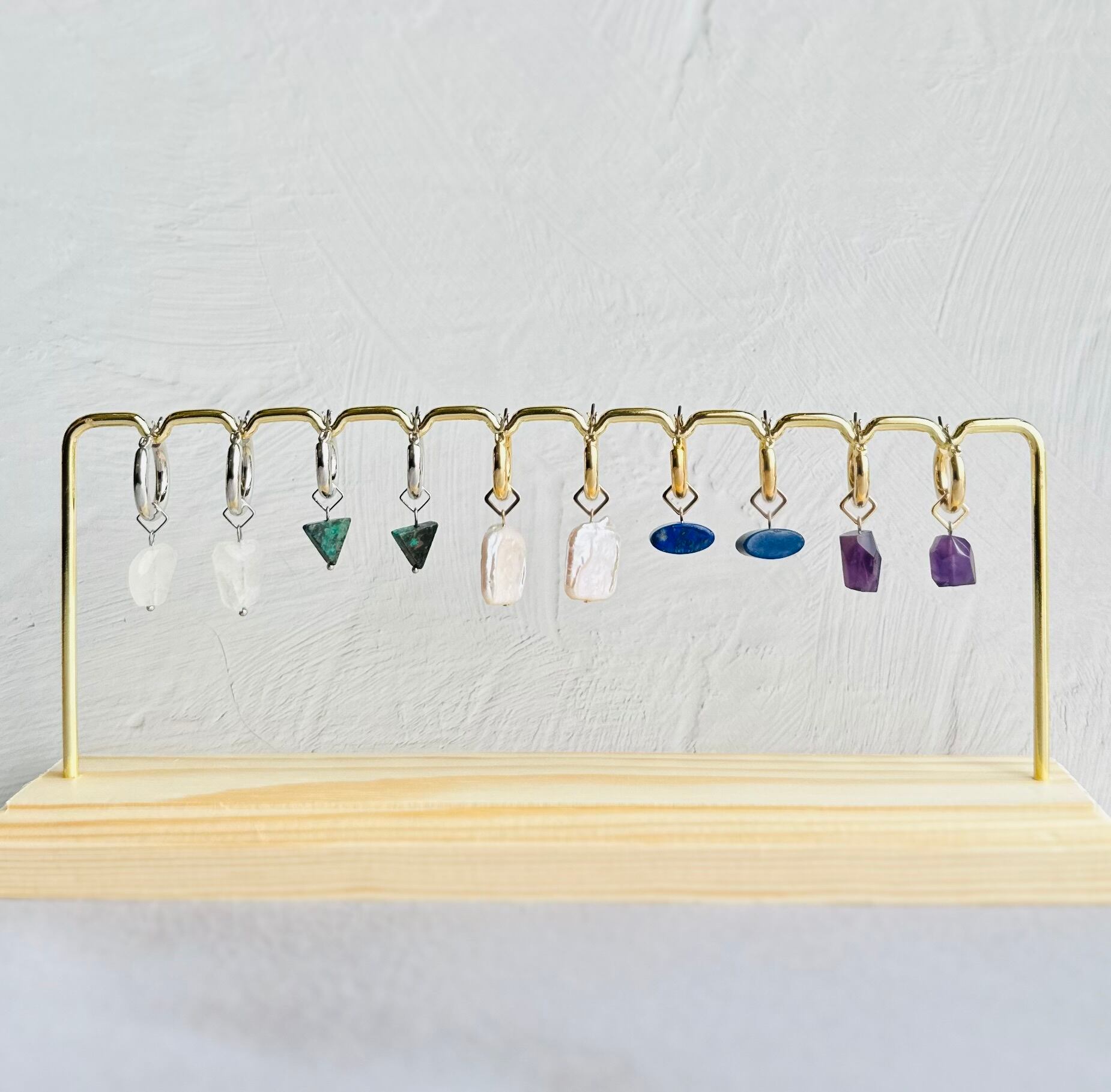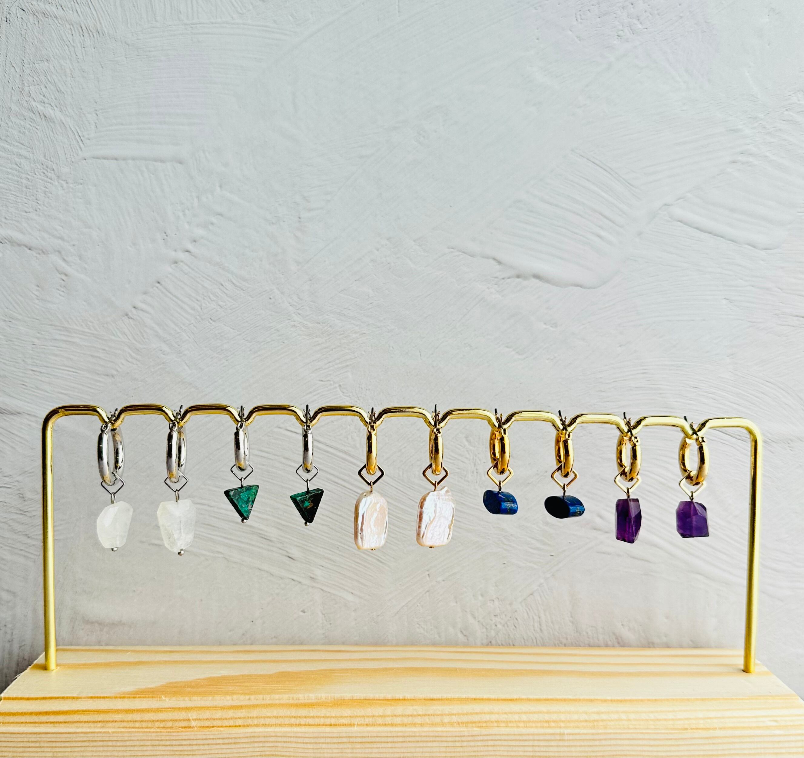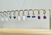それぞれの天然石が魅力的な、フープピアスです。シンプルながらも、石の種類や色合いが異なるので、毎日アクセサリーを楽しむのにぴったりです。